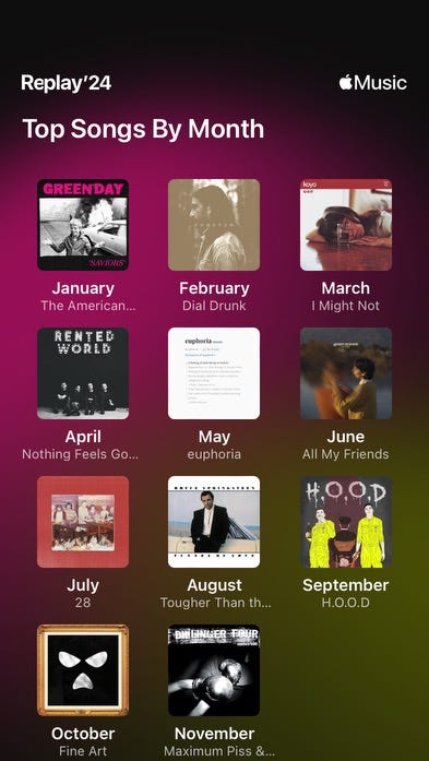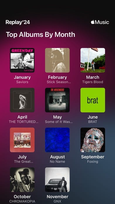 Unfortunately, there wasn’t enough data to get where I was in December, but I probably will check it more frequently throughout next year. Apple does offer monthly replay to get a sense of what your listening habits are throughout the year. Hopefully, there will be some surprises in 2025, and we’ll have more exciting songs.