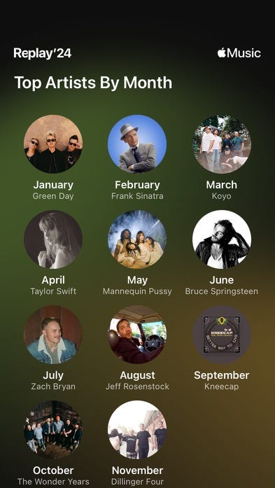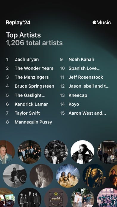 Of all the categories, the albums are the least surprising. I wish I knew how album plays were quantified by Apple’s algorithm, but most of the records are albums that ended up in my year end list. Stick Season (Forever) did land at number two, but I think that’s because this was when I finally clicked on Kahan. The Gaslight Anthem’s History Books also landed there, but that was a late favorite from 2023, and I did go to see TGA this year. The same goes for Spanish Love Songs’ No Joy, plus the fact that “I’m Gonna Miss Everything” was a go-to running song for me for a phase.