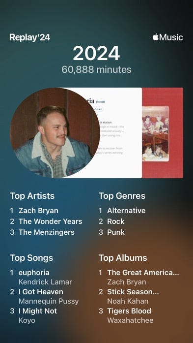 Last week, Spotify released their yearly “Wrapped” feature where people could see their music-listening stats for 2024. Apple Music released their similar “Replay” feature, which admittedly has seemingly figured out the strongest way to model their own year-end feature. There were some gripes about the design for Spotify’s Wrapped this year, which lead to further criticism from layoffs earlier in the year. Of course, there were the usual (and extremely justified) reminders about how little streaming services pay artists, and I’d like to take some time to encourage you to buy some merch from your top artists or try to see them on tour. That is going to benefit them much more than just streaming.