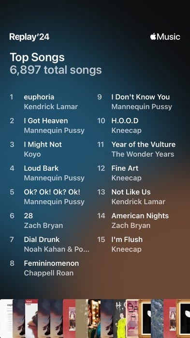 Ironically, my top songs were a better reflection of my top album for the year than the artists list was. The artist with the most songs was Mannequin Pussy, with their song “I Got Heaven,” landing at number two. (Kneecap has the second most songs, followed by Zach Bryan and Kendrick Lamar, who are each tied with two).