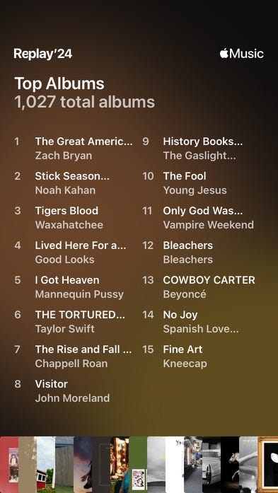 The only 2024 albums that didn’t make the cut on my year-end list were Bleachers’ self-titled album and Vampire Weekend’s Only God Was Above Us, which were both last-minute contenders. I spent some time late this week and last week listening to them to consider if they’d make the cut. I’m just surprised they ended up in the 11th and 12th spots on my Replay.